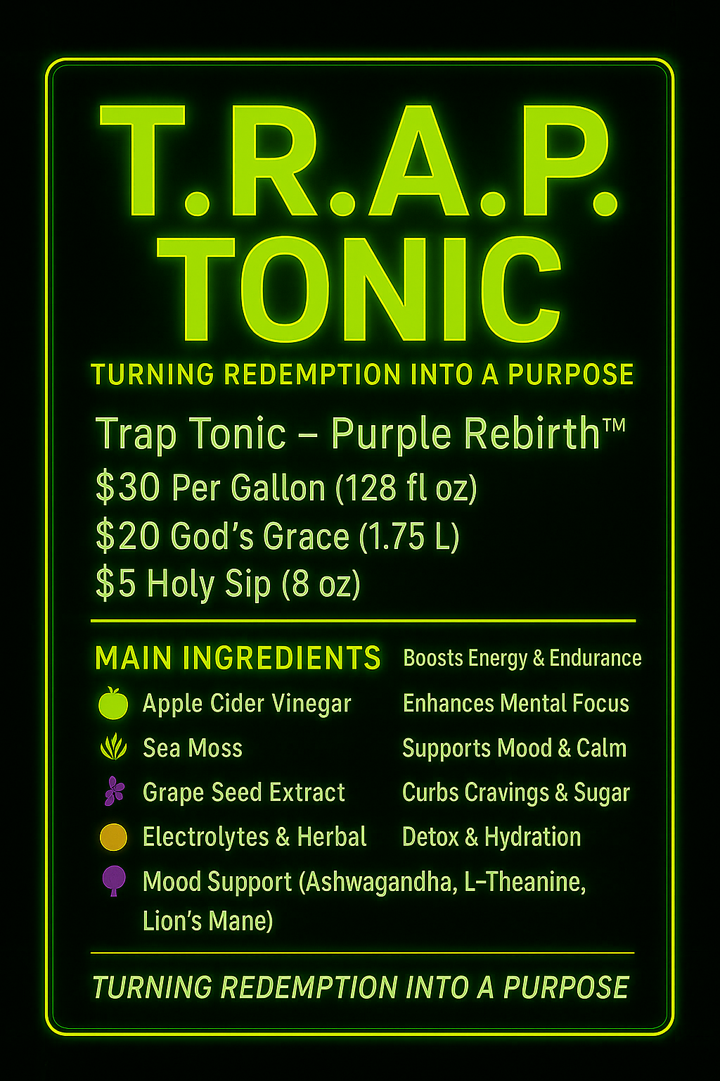 Trap Tonic- A drink that hits like repentance in a bottle. Survival fuel..Spiritual drip.